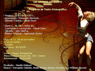 A Cia Artista do Corpo, em parceria com o coreógrafo Fernando Machado, fará curta temporada de um programa intitulado "Teatro Coreográfico" no Espaço dos Parlapatões, em São Paulo. Serão apresentadas duas obras da Cia, divididas em parte 1 e parte 2.